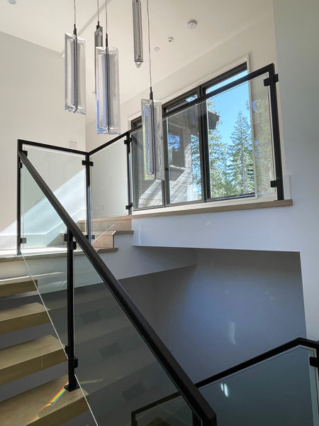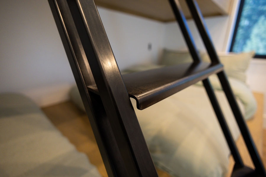 Mono stringer staircase, handrails with 1/2" tempered glass, exterior guardrails, custom mirrors throughout baths and custom patina bunkroom ladder and rails.​